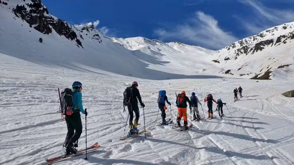 - Esquís y fijaciones de montaña (tipo cangrejo o tipo placa), pieles de foca, cuchillas, botas de esquí de montaña, bastones, pala, sonda, arva, casco, mochila 30-35 litros, dos pares de guantes, ropa adecuada a la actividad (impermeable tipo GORE-TEX).