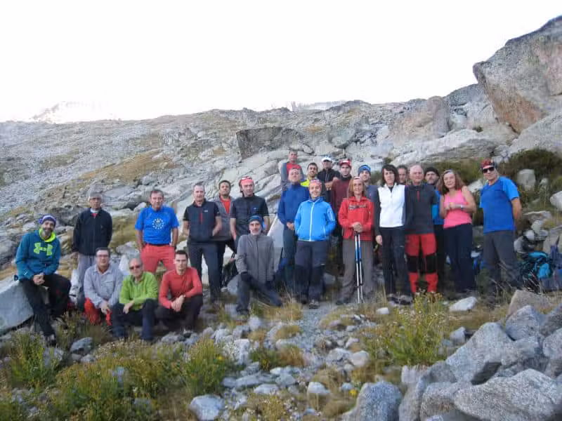 Cerca ya del ibón baixo de Coronas, el segundo de los tres lagos de montaña (con el iboné y el alto) por los que pasaremos, el grupo se divide y 6 miembros del grupo viran su brújula hacia el pico Aragüells (3.037 m) e ibón de Cregüeña, mientras que los otros 19 continuamos con el Aneto como destino.