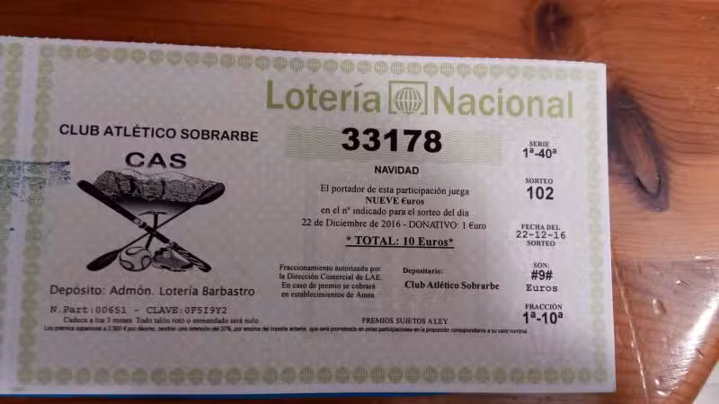 Sirva pues esta pequeña misiva para comunicaros a todos, socios y simpatizantes del Club, o amantes de la Lotería sin más, que nuestro número 33178 se encuentra depositado en la Administración Elena de Barbastro y se puede adquirir en muchos establecimientos de Aínsa por el precio de 10 euros cada participación (9 de juego y 1 de recargo, debidamente autorizados por la Delegación de Hacienda).