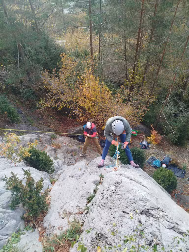 La formación se centraba en autoayuda y rescate en actividades de escalada deportiva de largos. Analizamos materiales, aparatos, sistemas y maniobras básicas.